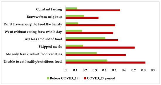Figure 4 illustrates the various categories of food insecurity experienced by the farming households before and during the COVID-19 pandemic in the study area. The result revealed that food insecurity was worse during COVID-19 compared to the pre-pandemic period. The majority (above 60.00%) of respondents did not have access to nutritious/healthy food, ate only a few kinds of food and skipped meals during the pandemic, whereas less than 50.00% experienced this kind of food insecurity situation beforehand. Furthermore, almost 50.00% of the respondents went without eating for a day, as well as having no enough food to feed the family during COVID-19, while less than 20.00% experienced this before the pandemic. The discrepancy may be due to the various disruptions caused by the pandemic conditions, such as income shocks, which limited the disposable amount spent on food, as well as disruptions in food supply chains, resulting in possible food shortages and spikes in food prices [1,33,73,84,85,86,87]. The result showed that rural households have become more food insecure, as the disruptions due to the pandemic have affected the food supply chains, food prices and access to food.
