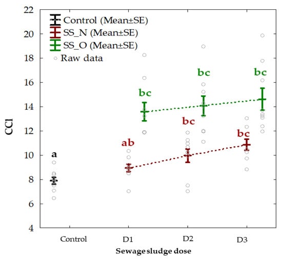 The application of the sewage sludge for maize fertilization significantly differentiated the relative chlorophyll content (CCl). As in the case of the dry matter yield, the CCl values in the SS_N and SS_O-fertilized plants were significantly higher than in the control and generally increased relative to the applied sewage sludge dose (Figure 1). The CCl values ranged from 29.5 to 32.7 in the SS_N plant samples and from 32.0 to 33.3 in the SS_O plant samples. However, the mean values of CCl determined in the SS_O-fertilized plants did not differ significantly from those noted in the SS_N-fertilized maize. Moreover, a large variability of results between the experiment series was observed, in the case of both SS_N and SS_O, as evidenced by the large differences between the minimum and maximum values (Figure 1). In contrast, the mean CCl values in the control maize leaves were relatively stable in the three experiment series (Figure 1).