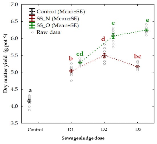 Dry matter yield of aboveground parts of maize plants relative to the dose and type of sewage sludge. Mean values (n = 9) ± standard error. Identical superscripts denote no significant (p > 0.05) differences between the experimental variants according to the post hoc Tukey HSD test. Explanation: SS_N—non-ozonated sewage sludge; SS_O—ozonated sewage sludge; D1, D2, D3—dose of sewage sludge—3, 6, 9 Mg ha −1, respectively.