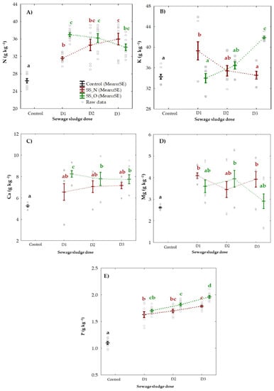 (A–E). Content of macronutrients (N, K, Ca, Mg, P) in the aboveground biomass of maize depending on the type and dose of sewage sludge (mean ± SE values from experiment series). Mean values (n = 9) ± standard error. Identical superscripts denote no significant (p > 0.05) differences between the experimental variants according to the post hoc Tukey HSD test. Explanation: SS_N—non-ozonated sewage sludge; SS_O—ozonated sewage sludge; D1, D2, D3—dose of sewage sludge—3, 6, 9 Mg ha −1, respectively.