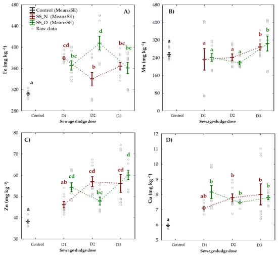 (A–D). Content of micronutrients (Fe, Mn, Zn, Cu) in the aboveground biomass of maize depending on the type and dose of sewage sludge (mean values from experiment series). Mean values (n = 9) ± standard error. Identical superscripts denote no significant (p > 0.05) differences between the experimental variants according to the post hoc Tukey HSD test. Explanation: SS_N—non-ozonated sewage sludge; SS_O—ozonated sewage sludge; D1, D2, D3—dose of sewage sludge—3, 6, 9 Mg ha−1, respectively.