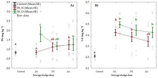(A,B). Content of toxic heavy metals (Pb, Cd) in the aboveground biomass of maize depending on the type and dose of sewage sludge (mean values from experiment series). Mean values (n = 9) ± standard error. Identical superscripts denote no significant (p > 0.05) differences between the experimental variants according to the post hoc Tukey HSD test. Explanation: SS_N—non-ozonated sewage sludge; SS_O—ozonated sewage sludge; D1, D2, D3—dose of sewage sludge—3, 6, 9 Mg ha−1, respectively.