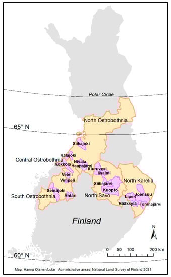 Location of farms in Finland where silage samples were collected in 2020. Yellow areas represent regions and purple areas represent municipalities where the farms were located.