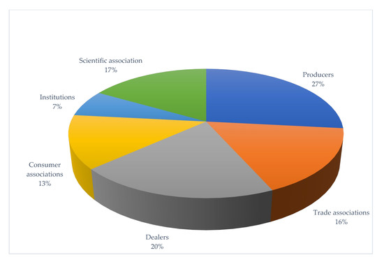 The types of stakeholders interviewed during the meetings were chosen to acquire useful information to build a picture of the perception of digital transformation, both in terms of strengths and weaknesses, and of possible reasons for potential adoption or distrust. In particular, the following groups were involved: producers, trade associations, retailers, consumer associations, institutions, and scientific associations (Figure 2).