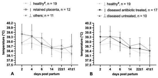 Mean values and standard deviation of rectal body temperature over the period of puerperium in cattle that remained healthy (grey dotted); (A) additionally specific disease patterns; (B) additionally diseased cows treated with antibiotic treatment and without treatment. Others: cows showing a pathological puerperium but no singular postpartum retention of the fetal membranes or all forms of puerperal disorders; # one healthy cow showed fever due to a different diagnosis.