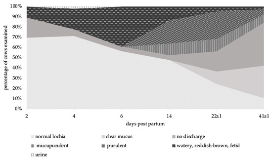 On day 6 p.p., 39.1% of the animals examined had a watery, reddish-brown and fetid vaginal discharge; this proportion decreased to 13.6% on day 14 p.p., at which time purulent (22.7%) and mucupurulent (11.4%) vaginal discharge first appeared. On day 22 p.p., 43.9% of the cows still showed a pathological vaginal discharge, 36.6% of the cows had clinically unremarkable vaginal discharge and no vaginal discharge could be detected in 19.5% of the cows. At the end of puerperium, the proportion of cows with a pathological vaginal discharge decreased from a peak at day 14 p.p. (47.7%) to 15.8% and the proportion of cows with clinically inconspicuous vaginal discharge increased to 42.1%, with 42.1% showing no vaginal discharge (Figure 3). It was found that the vaginal discharge in some cows took on different characters over the study period and that different forms merged into one another.