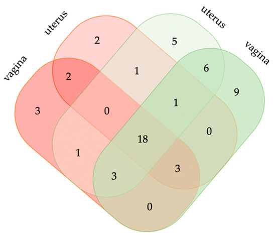 The Venn diagram (Figure 5) illustrates the number of genera that were shared between the uterus and/or vagina in a healthy and/or diseased state at any of the samplings (day 2, 4, 6 and 14 p.p.) within a 14-day period. Only 18 genera were found in all kinds of specimen and health states. Vice versa, seven genera were found in diseased cattle only: three in the vagina, two in the uterus and two in both localizations.