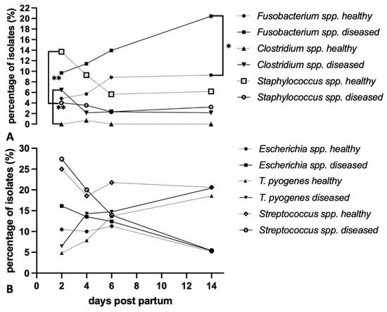 (A) Percentage of isolates of selected genera that were significantly more abundant in healthy animals (n = 12; Staphylococcus spp.) or in diseased animals (n = 10; Fusobacteria spp., Clostridium spp.) over the entire sampling period (day 2, 4, 6, 14 p.p.); Chi-squared test comparison between healthy and diseased cows per sampling time point and genus: * p < 0.05, ** p < 0.01. (B) Percentage of isolates of selected genera that showed no significant differences between healthy and diseased animals over the combined sampling period but were among the most frequently isolated genera.