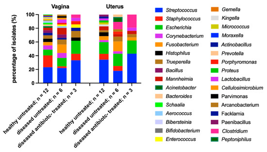 Comparing the influence of antibiotic use in the vagina and uterus depending on health state and antibiotic treatment, an absence of the genus Staphylococcus spp. can be observed in the uteri of the diseased, antibiotic-treated cows at day 2 p.p. The presence of the genus Clostridium spp. in the diseased animals and even an increased occurrence in the cows under antibiotic treatment should be emphasized (Figure 7). The genus Escherichia spp. still accounts for 19.0% and 18.2% of isolates, respectively, in animals under antibiosis in both the vagina and uterus. Thus, there is even a higher occurrence of the genus Escherichia spp. in the vagina (19.0% compared to 12.2%) and an almost equal occurrence in the uterus (17.9% compared to 18.2%) in treated cows, compared to the sick, untreated animals. Bacterial diversity was greatest in the untreated healthy animals with a total of 26 genera, compared to 19 genera in the diseased, untreated animals and 12 genera in the diseased, antibiotic-treated cows; however, different numbers of cows in each group (12 vs. 6 vs. 3) may have contributed to that observation.