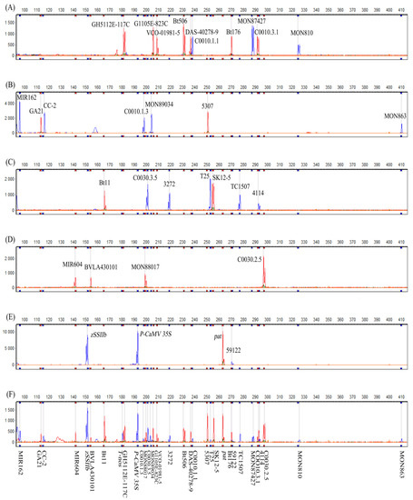 Using fluorescence CE, we successfully constructed a GM multiplex assay system for 33 targets, which were divided into five multiplex PCR panels (see Section 2.4 for details). To ensure the relative consistency of amplification peak heights of the 1% GM samples (i.e., the amplification efficiency of the targets), we optimized the primer concentrations in each system by increasing the concentration of primers with low peak heights and decreasing the concentration of primers with high amplification efficiencies in the multiplex system. We also determined that amplification of the endogenous reference gene using a primer concentration of 0.06 µM resulted in a peak height similar to those of the other samples. Multiplex PCR was performed for each single event, and different amplification products within the same multiplex panel assay were mixed and electrophoretically separated. As shown in Figure 2A–E, each multiplex assay resulted in a normal pattern of panel-specific peaks of the expected fragment sizes. These specific peaks and fragment sizes were consistent with the results of simplex PCR, thus confirming our previous observations that the sizes of the amplified fragments were constant and distinguishable. When the products of the five multiplex PCR panel assays were mixed and subjected to electrophoresis, the targets were still correctly identified (Figure 2F). The 33 GM targets could be identified in a single electrophoresis well. By exploiting the high resolution of CE in combination with the automatic identification function of SSR Analyser, we had achieved our goal: automating the identification of 33 different targets within the same electrophoresis well.