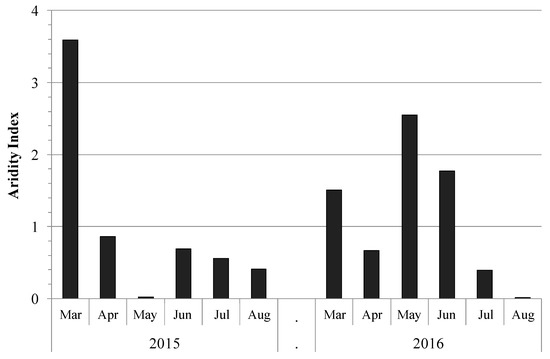 The monthly aridity indexes (AI) as the (precipitation)/(temperature ratio+10)) were calculated as reported by Mancinelli et al. [25] throughout the study periods and are reported in Figure 1.