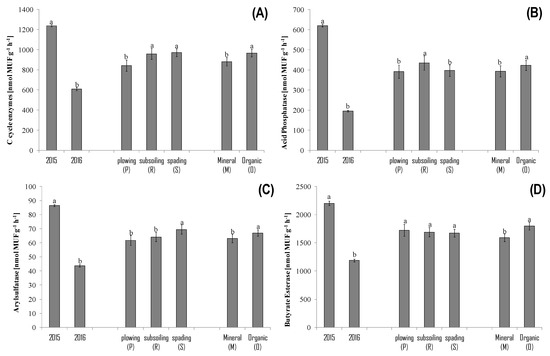 Soil enzyme activity in the main treatments (year of experiment, tillage and fertilization): (A) enzyme activities involved in C cycle, (B) acid phosphatase, (C) butyrate esterase, and arylsulfatase (D). Different letters indicate significant differences (p < 0.05), bars are standard errors (n = 3).