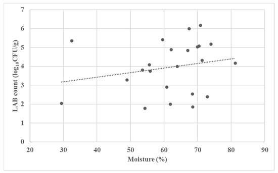 The final total microbial counts were composed mostly of LAB, and their viable cell number did not depend on the final water content of the feed, as the correlation coefficient was only 0.219 between the water content (range 29–81%) of the fermented forages and viable LAB count (Figure 2).