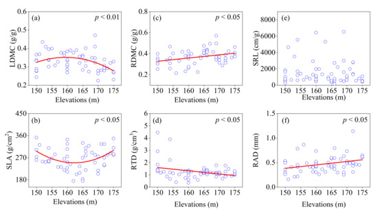 Effect of elevations on the community weighted mean (CWM) traits values of leaf dry matter content (LDMC) (a), specific leaf area (SLA) (b), root dry matter content (RDMC) (c), root tissue density (RTD) (d), specific root length (SRL) (e), and root average diameter (RAD) (f).