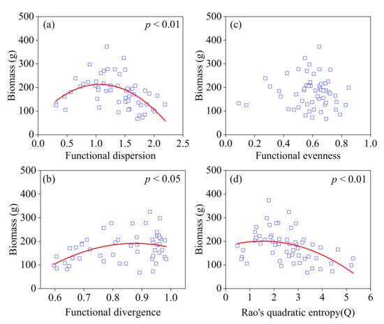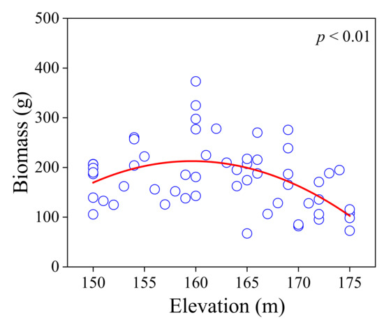 The taxonomic diversity, including Shannon–Winner diversity and Simpson diversity, were calculated by the “vegan” package in R, and functional diversity metrics including functional dispersion, functional evenness, functional divergence, and Rao’s index were calculated by using the “dbFD” package. The relationships between CWM/biomass and the elevation and how AGB related to CWM, taxonomic diversity, and functional diversity were analyzed with the linear model and quadratic regression, and goodness-of-fit was evaluated by p-value (p < 0.05). A generalized additive model (GAM) was used to test the relative effect of taxonomic diversity, CWM, functional diversity, and elevation on AGB [41]. The original formulation of this model is