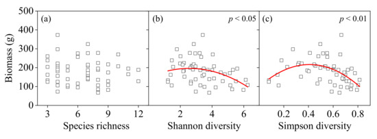 AGB was unrelated to species richness, whereas it was linked to a nonlinear relationship with Shannon diversity and Simpson diversity; that is, AGB increased and then decreased with increasing Shannon diversity and Simpson diversity (Figure 4a–c). A higher AGB value was associated with a Shannon’s value of 2–4 and Simpson’s value of 0.3–0.65.