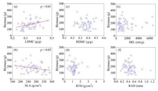AGB was found to be positively related to the CWM trait values for LDMC and negatively related to CWM for SLA (Figure 5a,b). However, the biomass showed no relationship with the root traits (Figure 5c–f).