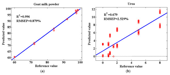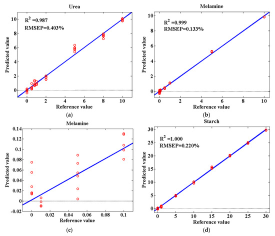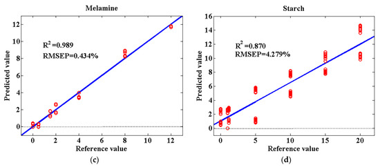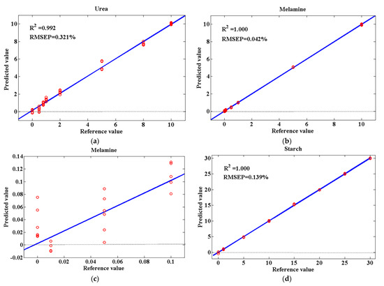 Urea and melamine are industrial chemicals. They are added to milk powder to increase the nitrogen content, resulting in a falsely high protein content. Starch is a kind of food ingredient and additive. It is allowed to be added to some dairy products. However, excessive addition unlawfully increases the profit on the sale of the product while reducing nutritional value. According to the above, adulteration concentrations of urea and melamine were lower than those of starch in this work. Concentrations of different adulterants largely ranged from low levels to high levels, which allowed us to consider prediction results under various adulteration conditions.