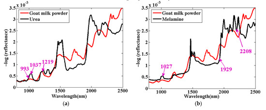To display the distribution of the characteristic wavelengths and to present the influence of spectral pretreatment, the average spectra of goat milk powder and the three adulterants after the application of optimal pretreatments are illustrated in Figure 5 with the flagged characteristic wavelengths. The scattering effect induced by the particle size of pure urea powder (mentioned in the Section 3.1) could be eliminated by spectral pretreatment (shown in Figure 5a). As can be seen from Figure 5, the characteristic wavelengths of 1037 nm in Figure 5a and 1027 nm in Figure 5b were distributed around an absorption peak, where spectral profiles after the NOR pretreatment exhibited more obvious differences between the goat milk and urea or melamine adulterant. Likewise, Masemola and Cho [43] selected 1027 and 1036 nm as the characteristic wavelengths to estimate leaf nitrogen concentration from the spectra (400–2500 nm) of whole fresh and dry leaves of Eucalyptus grandis. As shown in Figure 5c, 1724 nm was selected as one of the key variables for quantification of starch adulteration in goat milk powder. Similarly, Qiu et al. [44] and Lee et al. [45] identified 1724 nm as the characteristic wavelength in their research on cultivar classification of sweet corn seeds and prediction of the amylose content of polished rice. The peak around 1724 nm corresponded to the first overtone vibration absorption of the -CH2 and -CH function groups in carbohydrate [44].