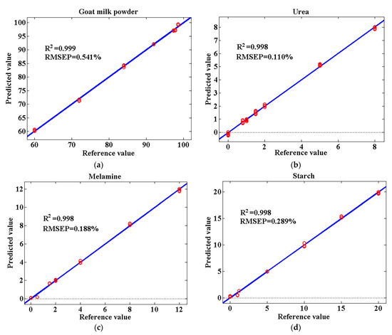 Predicted vs. reference plots for prediction set of the MCR-ALS model for goat milk powder determination (a), urea determination (b), melamine determination (c), and starch determination (d) based on the spectra without pretreatment.