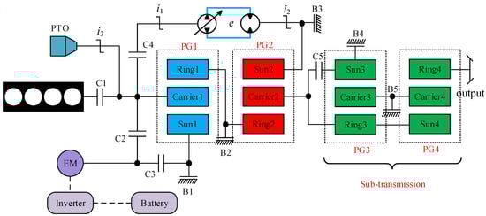 A mechanic-electronic-hydraulic powertrain system with independent intellectual property rights was designed for tractors, and the main components are shown in Figure 1. The powertrain system consists of a diesel engine, an electric motor (EM), a set of power batteries, a variable displacement pump, a fixed displacement motor, four planetary gear mechanisms, three fixed shaft gears, five clutches, and five brakes. Where C1~C5 are clutches, B1~B5 are brakes, PG1~PG4 are planetary gears, i1~i3 are the transmission ratios of gear pairs, and e is the displacement ratio of the hydraulic system.
