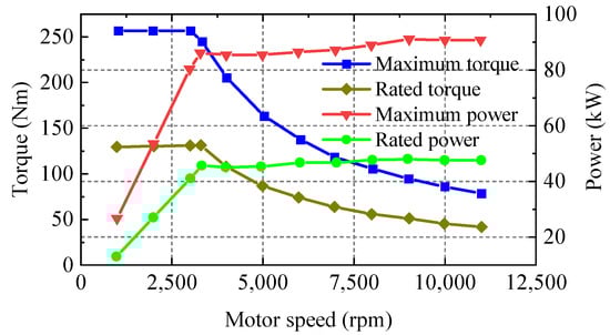 This paper selects the TZ205XS85K01 motor as the research object and gives experimentally measured maximum rated output torque; maximum rated output power curves of the motor shown in Figure 4.