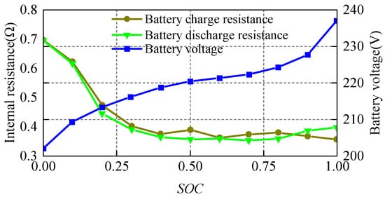 The internal resistance and the open-circuit voltage of the NiMH battery connected in series about SOC curves are shown in Figure 5.