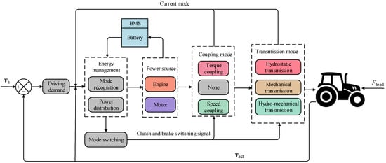 The overall control strategy architecture of the tractor is shown in Figure 8. Firstly, the power demand of the tractor is determined based on the current tractor speed and the target speed of the driver as well as the real-time load of the tractor, then the optimal economy driving mode is selected according to the real-time battery SOC, and according to the tractor’s current mode to consider whether to switch the mode. The most suitable driving mode is selected between pure electric drive, pure engine drive, torque coupling drive, and speed coupling drive. Finally, the appropriate transmission mode is selected between hydrostatic transmission, hydro-mechanical transmission, and mechanical transmission to meet the optimal power transmission.