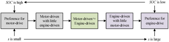 The equivalence factor (s) can equate the power consumption of the battery with the fuel consumption of the engine and calculate the power distribution combination corresponding to the lowest fuel consumption of the engine and the motor at any moment. The equivalence factor reflects the tendency of energy use, if s is large there will be a preference for using fuel and more power output from the engine; if s is small there will be a preference for using electricity and more power output from the motor [34]. Considering the SOC and energy distribution strategy, fuel consumption is saved through motor-driven if SOC is high; lower SOC is avoided through engine-driven if SOC is low. The special relationship between the equivalence factor and SOC can achieve the best power distribution between power sources and ensure the SOC within the high-efficiency region [35]. The above analysis obtains the relationship between SOC, equivalence factor, and power distribution shown in Figure 11.