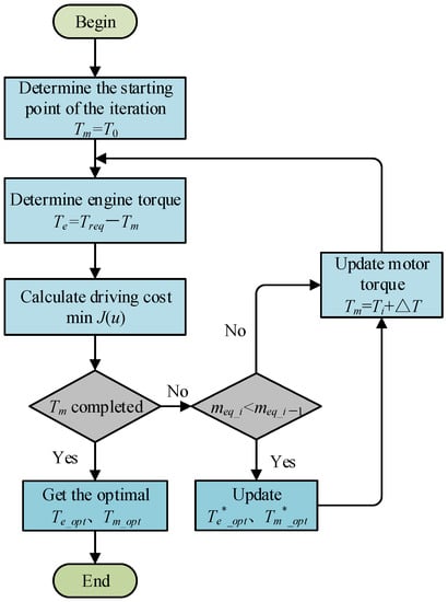 Taking the motor torque as the control variable, the equivalent fuel consumption of all possible combinations of engine and motor torque is calculated according to a certain iterative gradient when the required torque is determined [38], and the combination of the lowest fuel consumption is taken as the optimal power distribution scheme, the calculation flow is shown in Figure 12.