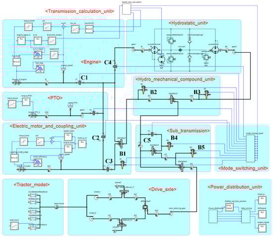 A tractor model equipped with the MEH-PS shown in Figure 13 was established in SimulationX. The performance of the powertrain can be evaluated through simulation. With the help of the component library of SimulationX, the engine model, motor model, transmission model, chassis model, mode switching unit, transmission ratio calculation unit, and power distribution unit are created using the cross-domain equation-based concept of the Modelica language. The tractor simulation parameters are shown in Table A1 (see Appendix A).