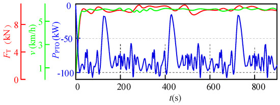 Electrification of road vehicles indicates that hybrid systems use battery energy to assist the engine to perform work at high loads, and use the remaining engine power to charge the battery at low loads, which can effectively reduce fuel consumption and improve vehicle performance, as well as for tractors [15,16]. Guo proposes a SOC-constraint-based energy management strategy, which was tested on a bus with a 5.9% fuel saving rate [17]. Kim found that hybrid tractors have a better economy than conventional tractors at part-load conditions due to the hybrid system regulating the engine operating point to an efficient region and turning off the engine for a purely electric drive when necessary [18,19]. A tractor starting with a load requires large torque because the electrical components’ power density is much smaller than the hydraulic components, which requires high battery and motor power, resulting in large equipment size. Hydraulic components make up for this shortcoming and have the advantage of starting smoothly with better comfort [20]. Another significant difference between tractors and road vehicles is the need for additional power to the power take-off (PTO), and one of the key issues in modern tractor design includes the independence of the PTO output speed from the wheel speed [21].