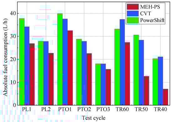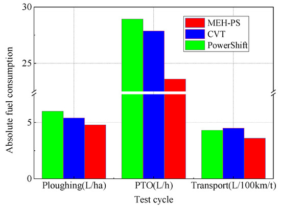 Comparing the results above, it was found that the transmission scheme proposed in this paper is 20% more fuel-efficient than PowerShift tractors under ploughing conditions and 9% more fuel-efficient than CVT tractors; 18% more fuel-efficient than PowerShift tractors, and 15% more fuel-efficient than CVT tractors under power output conditions; 15% more fuel-efficient than PowerShift tractors and 19% more fuel-efficient than CVT tractors under transport conditions. The above results further demonstrate the reliable fuel-saving capability of the proposed scheme and the developed energy management strategy in this paper.