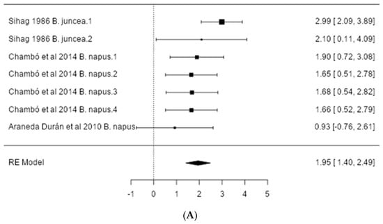 A recent meta-analysis conducted with B. napus, a self-compatible species, showed that pollinator abundance is consistently important in predicting yield in this crop [34]. To date, no meta-analyses have been conducted to examine the effect of insect pollination in yield parameters across the broad spectrum of cruciferous crops, nor have there been meta-analyses examining the effects of insect pollination on yield parameters separately for self-compatible and self-incompatible species. Self-incompatible Brassicaceae species typically have larger flowers than self-compatible ones in order to attract pollinators, with a significantly reduced seed set in the absence of pollinating agents [35,36]. Given the evolutionary advantage of selfing as a reproductive assurance when there is a paucity of pollinators [37], insect pollination is likely to have more marked positive effects on yield parameters in self-incompatible Brassicaceae species than in self-compatible ones.