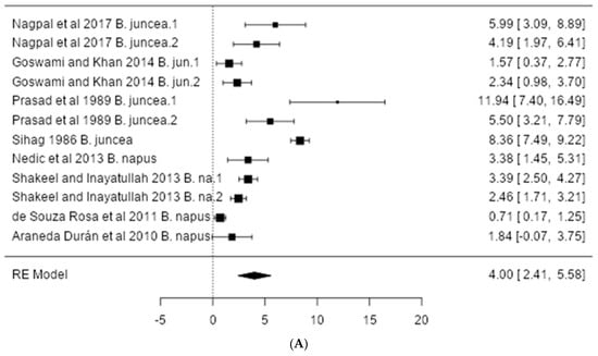 The references included in this review were sourced from the Web of ScienceTM and Scopus databases. Additional publications on the topic were found in the social networking site for scientists and researchers ResearchGate. The species found were 10, including Brassssica oleracea L., B. carinata, B. juncea, B. napus, B. rapa, C. sativa, Eruca sativa Mill., R. sativus, S. alba, and Thlaspi arvense L. (Brassicaceae). Thlaspi arvense was, however, not included in the analysis because the only study available [38] did not include all the necessary statistical data for its inclusion. References were not limited by year of publication, with the exception of B. napus. In this crop, given the large amount of studies conducted, only studies published from the year 2000 onwards were included in the analysis. As an exception, one publication from 1986 [31] was used for B. napus because it also included studies on several crop species included in this review. The studies included in the meta-analysis were published between the years 1986 and 2019 and had been conducted in Brazil, Chile, Finland, Germany, India, Nepal, Pakistan, Serbia, and the UK. Studies on insect pollination and yield parameters from other countries were either unavailable or did not include the necessary statistical data. The latest retrieval date of the reviewed papers was January 2021. The corresponding authors of the 78 publications assessed for eligibility (Figure 1) were in some cases contacted by e-mail to ask for clarifications regarding the type of cultivars used and the statistical analysis presented. The yield parameters examined were: seed yield measured as seed weight (per plant, area, or open flower) (Y); unitary/group weight of seeds (WS, 1, 100, or 1000 seeds) (henceforth when mentioning seed weight alone, the reference will be to this unitary/group measurement of seed weight); number of seeds (per area, plant, or branch) (NSP); number of seeds (per either silique or open flower) (NSSQ); number of siliquae (per either plant or area) (NSQ); silique set (SQS); silique length (SQL); seed germination (G); and oil content (O). When one publication included research conducted with several cultivars, the study was considered as one, unless the cultivars had for some reason been studied separately (see publications listed in Table 2). Although there can be varying degrees of self-compatibility and self-incompatibility among the species and varieties of Brassicaceae, B. napus, B. juncea, B. carinata, C. sativa, and S. alba are considered mostly self-compatible [35,38,39,40,41], while B. oleracea, B. rapa, E. sativa, and R. sativus are considered mostly self-incompatible and thus require cross-pollination [31,35,41]. To identify the main taxon groups of pollinators attracted to crops of the family Brassicaceae, for each study found on the topic, the insect families named among the five top most abundant pollinators were selected for each crop species and country.
