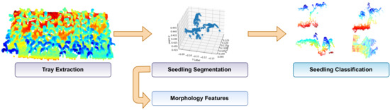 This section presents a methodology for extracting, segmenting, and classifying scanned seedlings in a greenhouse. The main procedure that involves the processing of the point clouds and obtaining the morphology of the seedling to determine its growth is divided into four stages: Tray extraction of the point cloud, seedling segmentation, morphology features extraction and seedling classification; see Figure 3.
