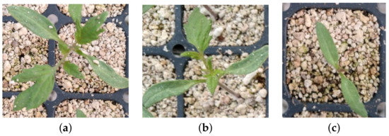 Growth stages. (a) Stage 1: Seedling with normal growth on the time of germination. (b) Stage 2: Seedling whose germination occurred days after the first stage with smaller size. (c) Stage 3: Seedling that germinated after the second stage, and it will grow outside of the estimated harvest time.