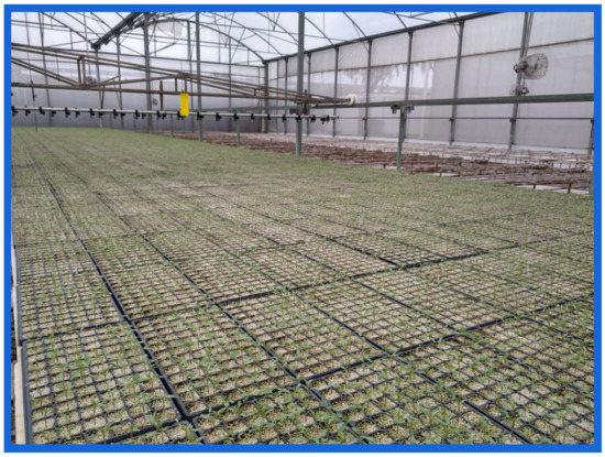 The tomato seedling cultivation process is divided into five stages: (1) Seed sowing, (2) storage in germination chamber for approximately 65 h, (3) tray extended on the greenhouse, (4) germination day count 15, and (5) harvesting. Table 1 shows the five stages of the cultivation process of three different productions that we monitored for this work. Figure 5 shows the Portos tomato seedling at 15 days after sowing. The trays show irregularities because not all the seedlings have the same growth level, thus complicating monitoring and production decisions. The A1 and B2 crops differ because a new sowing technique was tried in A1. This change in sowing technique did not affect the harvest or the methodology proposed in this work.