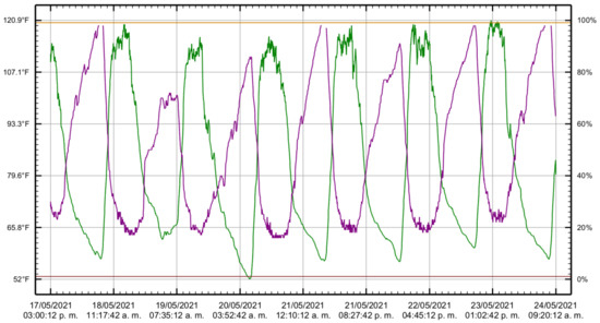 Ambient temperature is vital in seedling development, so it is crucial to control the greenhouse environment. If the temperature drops outside the greenhouse, the humidity rises inside. Conversely, the moisture drops inside if the temperature rises outside the greenhouse. In central Mexico, during the summer season, the outside temperature varies on opposite poles. During the day, the temperature increases, and during the night, the temperature drops. The heat of the day allows an accelerated development of the seedling with low humidity while the humidity increases during the night. Therefore, we controlled the conditions inside the greenhouse. Figure 6 shows the temperature and humidity changes from 17 May to 24 May 2021. The green line represents the temperature, the purple line is the humidity, the horizontal line in mustard color is the high alarm, and the horizontal line in brown color is a low alarm. These climatic parameters play an important role in production.
