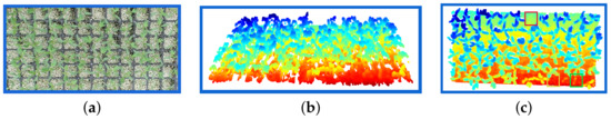 This section describes two stages: Tray extraction and tray cavity segmentation. When the system starts, the user provides the tray size which is used to determine the extraction polygon, and the system automatically adapts the extraction and segmentation. Figure 7a shows 72 cavity trays; Figure 7b shows the point cloud in the same tray with cavities captured using the Kinect V2.0 sensor. The color in the seedlings indicates the height, where the blue color represents the highest and red the lowest. In the point cloud shown in Figure 7c, the red-colored boxes indicate empty cavities where the seed did not germinate, the yellow-colored boxes show cavities with late seedling germination, and the green boxes show seedlings with low growth. These three boxes represent production failures. There is no way for the seedling in the red, yellow, and green boxes to achieve the seedling development categorized as stage first.
