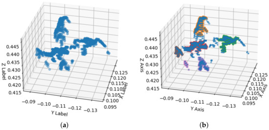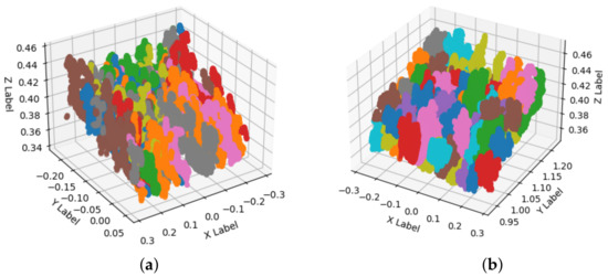 Once we extract the trays from the point cloud, we used K-Means, and GMM methods to segment the cavities of the trays. Figure 8a shows the segmentation result using the K-Means algorithm and Figure 8b shows the segmentation performed with the GMM technique. Each segmentation is stored and processed in . Each color change represents a segmented cavity; due to graphic limitations of the programming language, in both images, the colors are repeated.