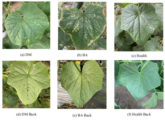 The cucumber dataset used in this paper was collected by mobile phones from October to November 2020 in Xiaotangshan National Precision Agriculture Research Demonstration Base in Beijing, with a total of 2542. Considering that the greenhouse smart device will inevitably capture the complex field background when collecting images, the images captured in this study all contain a field background. Due to the characteristics of bacterial angular leaf spot and downy mildew on the abaxial cucumber leaves only occurring in high humidity morning environments, images were collected between 7 am and 9 am. The images in the cucumber disease dataset can be divided into 6 categories (e.g., the backside of the downy mildew leaf (DM Back), the front side of the downy mildew leaf (DM), the backside of the bacterial angular spot leaf (BA Back), the front side of the bacterial angular spot leaf (BA), the backside of the healthy leaf (Health Back), and the front side of the healthy leaf (Health)), as shown in Figure 1. Because of the large differences between the symptoms on the adaxial and abaxial of cucumber leaves, the front side and backside of cucumber leaves are divided into two classes. The amount of data for each category is shown in Table 1. In this study, the dataset is randomly divided into the training set, test set, and validation set according to a ratio of 6:3:1.