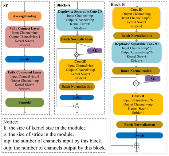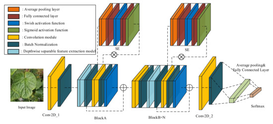 The structure of BlockA and BlockB is shown in Figure 3. BlockA and BlockB are mainly composed of a depthwise separable convolution module, a squeeze-and-excitation module (SE), and a conventional convolution module. One important difference between BlockA and BlockB is that BlockB initially uses a conventional convolution block to expand the number of channels in the feature map. It can help the model in obtaining more high-semantical features of disease spots. The conventional convolution module in BlockA and the second conventional convolution module in BlockB only fuse features obtained from SE, and it does not change the number of channels. At the same, to avoid the gradient divergence problem, a shortcut connection is used in the model to add feature maps extracted at different stages. The two blocks not only have lower computation and parameter amounts but also can guarantee the classification accuracy of the model. Thus, we used the two blocks to construct the cucumber disease classification model in this study.