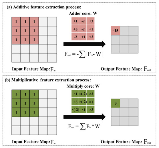 For the edge devices with limited battery capacity, using the additive feature extraction method can make these devices work longer [22]. The process of feature extraction can be regarded as measuring the similarity between the feature map and the feature extraction kernel. Thus, it is feasible to use addition instead of multiplication to calculate the distance of feature maps and feature extraction kernels. As shown in Figure 4a, the first normal form is used to calculate the cross-correlation between feature extraction kernels and feature maps. In this manner, the additive feature extraction method can be used to extract features from images. The forward propagation calculation formula of the additive feature extraction method is shown in Equation (2):