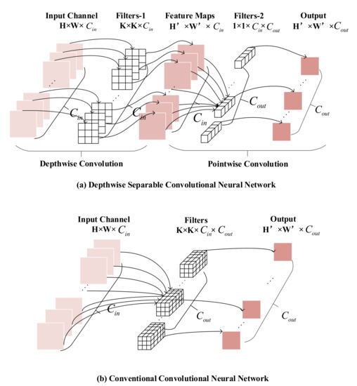 The first step is depthwise convolution, the number of channels in filters is one, and the number of filters is the same as the number of channels in the input feature map. The second step is pointwise convolution, which uses the convolution kernel with a kernel size of 1 to fuse feature maps in depth to obtain the final feature map. It is noticeable that the number of channels in filters is the same as the number of feature maps extracted from the previous step. It can be observed that the dimensions of feature maps extracted by the depthwise separable convolution module are consistent with that extracted by the conventional convolution module. The computation and parameter amounts of the depthwise separable convolution module and conventional convolution neural network are shown in Equations (12) and (13), respectively: