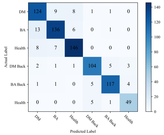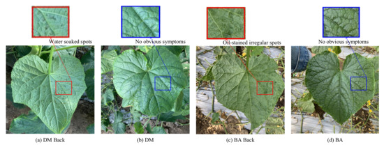 It can be seen from Figure 6 that the category of DM is easily misclassified into the category of BA and Healthy. The category of BA is easily misclassified into the category of DM and Health. Moreover, the category of Health is easy in being classified into BA and DM. This is mainly because the collection cycle of this dataset runs through the entire disease development period, and there are a large number of leaves at the disease initial stage. As shown in Figure 7, in the early stage of the disease, the disease spots of DW and BA are similar, and both of them have yellow punctuated spots. In addition, these disease spots of the two categories are small in the early disease stage; thus, it is easy to be confused with healthy leaves. In the early stage of the onset of downy mildew, the leaves on the back of the leaves will show water-soaked massive lesions, and bacterial angular spot disease will show oil-stained irregular round spots; thus, it is not easy to misclassify different types of leaves on the backside of the leaves. Distinct from the DW and BA, the symptoms of these disease lesions are very clear on DW Back and BA Back, even in the early disease stage. In the early stages of downy mildew, the leaves on the backside have water-soaked lesions, and the backside of the bacterial angular spot leaf shows oil-stained irregular round spots, which causes the classification accuracy on the two categories to be relatively higher.