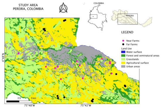 The study was conducted in the rural area of the city of Pereira, Risaralda, Colombia, located between 4°43′4.8″ N and 75°50′38.4″ W and 4°52′15.6″ N and 75°36′18″ W. The farms are located between 1221 and 1922 m.a.s.l. (meters above sea level) (Figure 2). The average temperature is 21.2 °C; the average total annual rainfall was 2301 mm and the relative air humidity ranges yearly between 73 and 79% [25]. Pereira occupies an area of 607 km2 and the approximate population is 467,269 inhabitants, of which 81,432 (17.4%) are residents of the rural area [26].