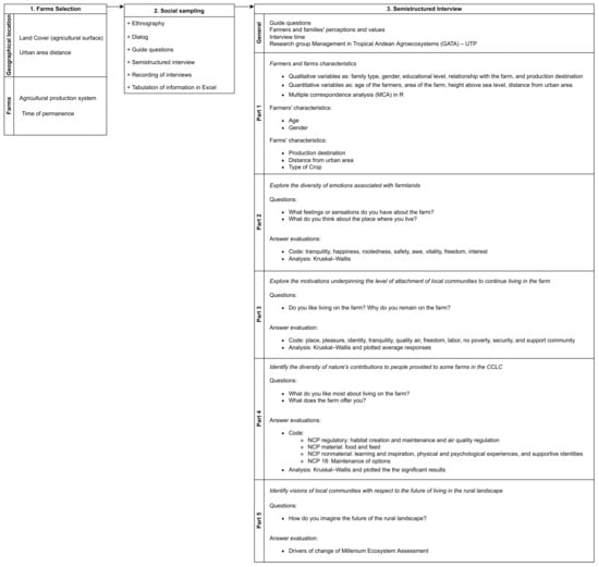 Sense of place is defined as a motivation for stewardship and actions to care for the environment and use the resources it provides. It is also presented as a cognitive and emotional variable that mediates how people respond to social-ecological change [16,17]. The human–nature relationship is nonlinear and often depends on the formations of relational values, i.e., values that arise from a relationship with nature, encompassing a sense of place, feelings of well-being (mental and physical health), and cultural, community, or personal identities [18,19,20,21]. Farmers have a complex relationship with farmlands as they have the ability to read nature and make decisions to protect or use resources. Additionally, farms are multifunctional landscapes (e.g., areas production, conservation, and relaxing zone) that can be related to specific relational values of farmlands [12,22,23]. The CCLC is shaped by mosaics (e.g., patches of interconnected crops and natural areas) and are inhabited by rural families holding beliefs, attitudes, and social norms that create farmland with high cultural value. Sense of place in this region has been described as a wide range of connections between people and places that develop based on the place meanings and attachment a person has for a particular setting [16,24]. We integrated the concept of nature’s contributions to people (NCP) framework developed by IPBES to capture a broad range of worldviews, knowledge systems, and stakeholders. The NCP approach recognizes the central and pervasive role that culture plays in defining all links between people and nature [21], and the importance of local knowledge for understanding meanings, motivations, and attachment to agricultural landscapes (Figure 1).