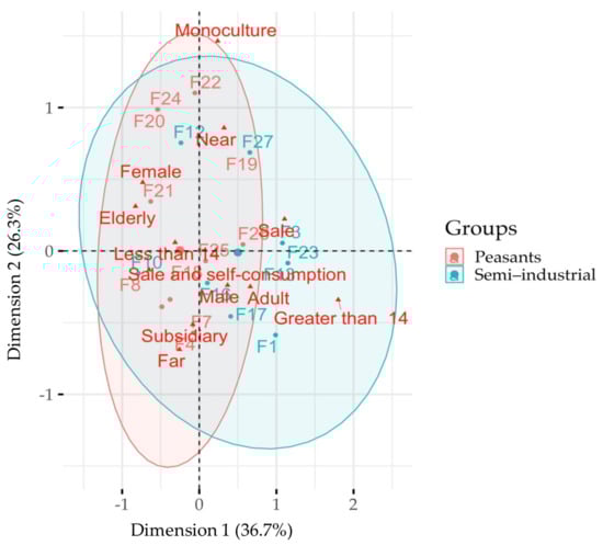 Two farming styles were identified, 66.7% with arrangements tending towards peasant and 33.3% towards semi-industrial farms (Table 1). The peasant style was characterized by farms with an area of less than 14 ha, with traditional crops, crop association, no hired personnel, and production destined for sale and self-consumption. In addition, in the peasant style, the person in charge of the farm’s activities and administration was the owner or an administrator who had been on the farm for more than 37 years. On the other hand, farms with a semi-industrial style were represented by farms with more than 14 ha, dominated by novel monocultures, with hired personnel for field work and the production was destined for sale. Additionally, we found that the person in charge of the farm was an administrator or hired worker who had been with the farm for less than 36 years.