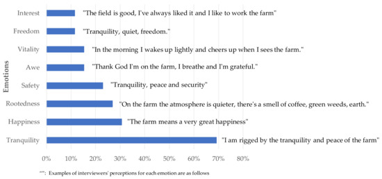 Results showed that farmers identified multiples emotions associated with living on the farmlands of the CCLC. Examples of these emotions included “the farm is a lot of peace, silence and tranquility” (tranquility); “The farm makes my soul happy” (happiness); “I don’t know. I feel nostalgia when I work in the fields because I remember my father, I imagine him working there” (rootedness); “The farm generates security” (safety); “The farm is wonderful” (awe); “The farm is life, I breathe pure and clean air” (vitality); “The farm is freedom” (freedom); and “Through the work on the farm I think and begin to philosophize” (interest). According to the classification of the emotions used, we found that tranquility (69%), happiness (31%), rootedness (27%), and safety (23%) were the most common emotions or feelings associated with farm landscapes, followed by awe and vitality (15%), freedom (12%), and interest (12%) (Figure 5).